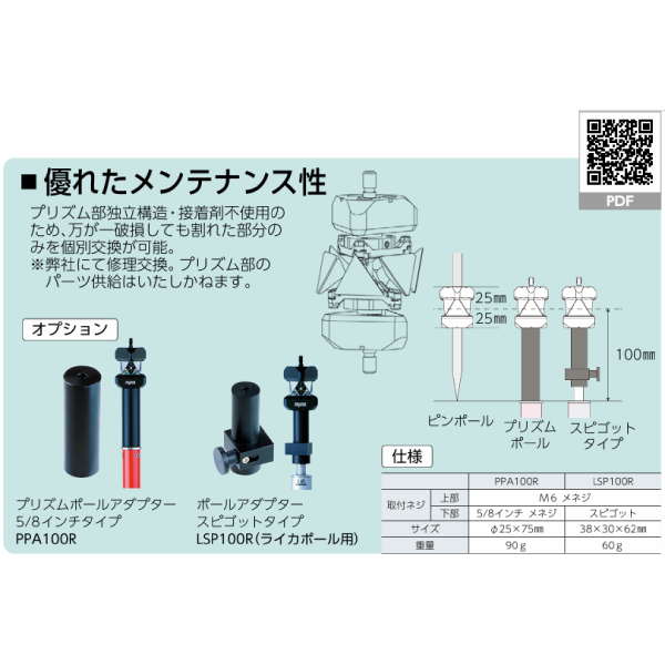 キャンペーン詳細 【特長】■プリズム部が独立構造・接着剤不使用のため、万が一破損した場合、割れた部分のみを交換修理が可能です。(プリズム部はマイゾックスにて修理交換。) ■最もよく使われている9mmφピンポールを使用。プリズム高を変更する場合は、ピンポールの長さで調整します。 【仕様】 | プリズム径 | 17mm | | プリズム定数 | -4.4mm | | プリズム高 | 25mm | | 視準可能範囲 | H:360° V:±25° | | 取付ネジ | M6オネジ(上部・下部) | | 水準器 | 40’/2mm (PC-40L) | | サイズ | 46×46×74mm | | 重量 | 約120g |